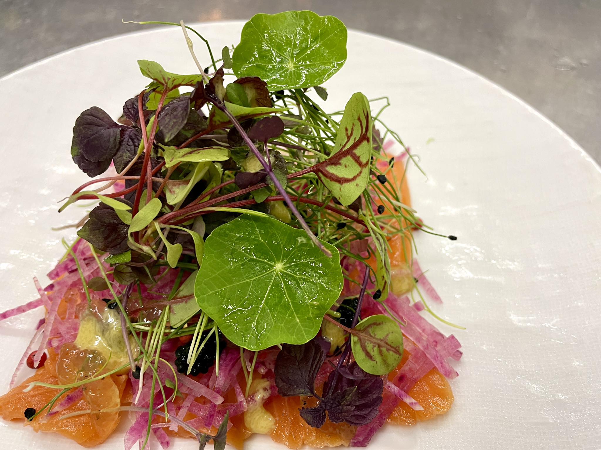 | 本日の鮮魚のカルパッチョ レモンジュレと彩り野菜 ¥1590 |