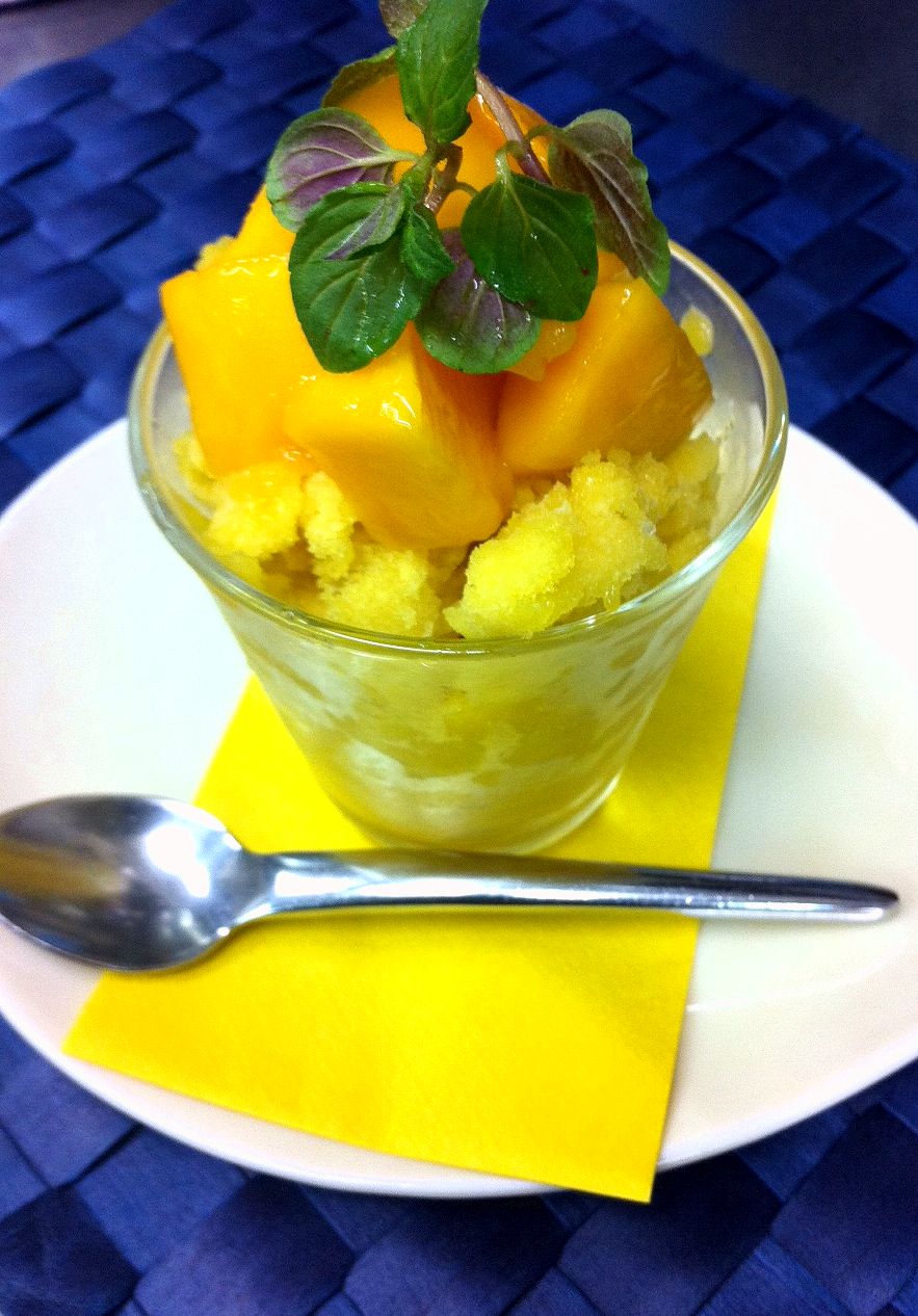 冷製パスタ【細切り生イカと緑の野菜の冷製フェデリーニ】、食後のドルチェ【完熟マンゴーのグラニータ】も始まりました~^^