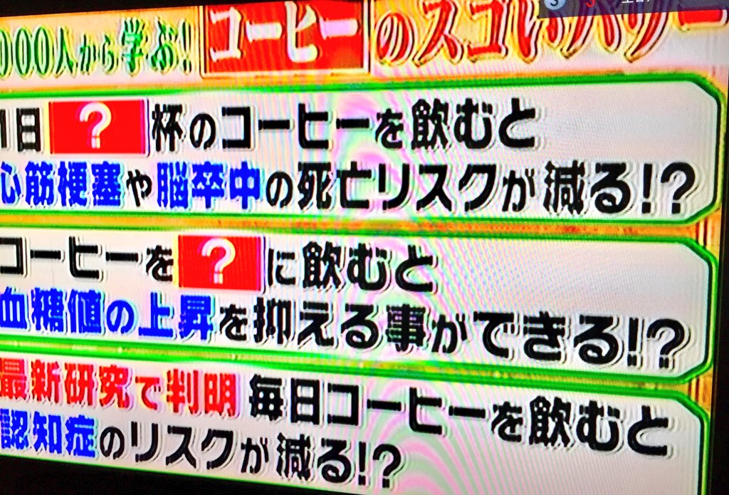 お休みに たまたま観ていたTV番組にコーヒーの素晴らしい効能が紹介されておりました^^ コーヒーを扱うお店として嬉しい事でした◎ 美味しく飲んで健康に良いなんて・・・\(^o^)/