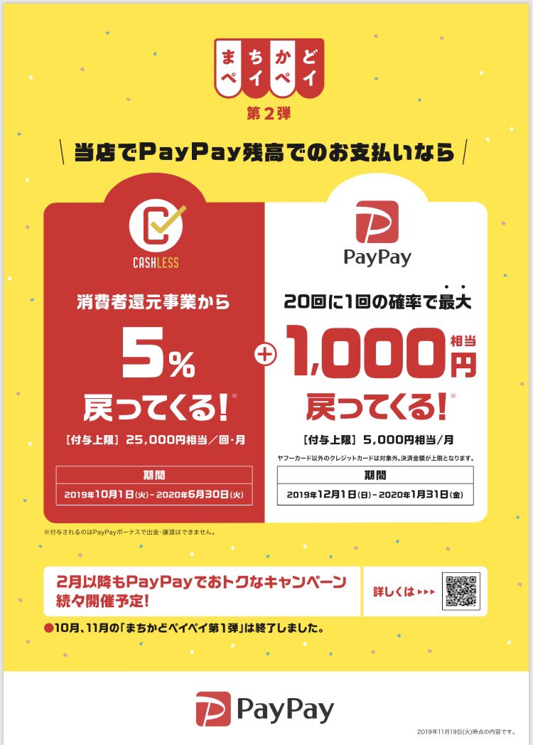 12月に入り消費者還元事業のキャンペーン第2弾が始まり、ペイペイでの決済がお得になるチャンスありだそうです◎