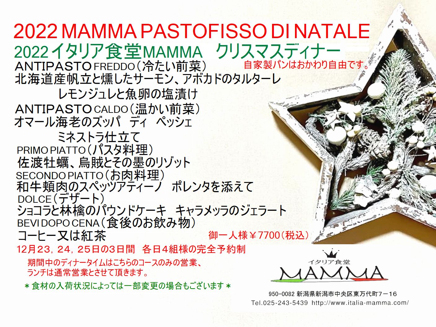 さて クリスマスディナー、ご予約受付が15日から開始となりますので、フライヤーをUP致します◎12月23.24.25日が金土日曜日にあたる好日程の今年♪ホームページ【ご予約】フォームからご予約の場合、日付が変わる前に受信したメールは無効となりますのでご注意下さいませ。こちらから→ https://www.italia-mamma.com/prenotazione/