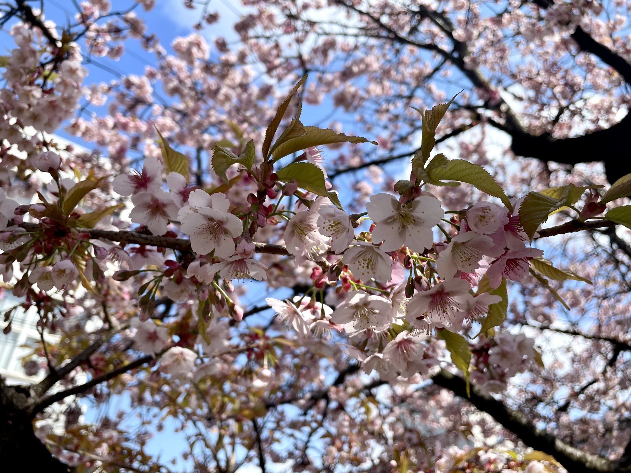 当店駐車場前、万代長峰小学校グランドの桜、数本は今満開です♪
